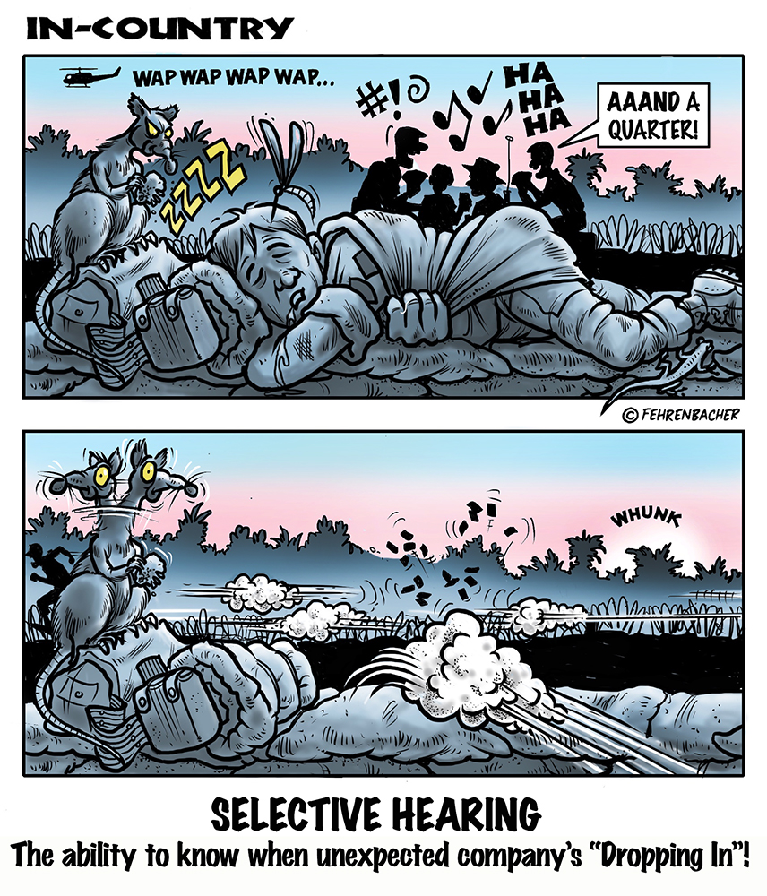 Phil enlisted in the Army in 1965 where you served for years in Vietnam. He became a graphic designer and has worked for the state of Oregon for 26 years. He retired in 2003 and started the Cartoon "In-Country". The cartoons reflect his experiences during his tour of duty in South Vietnam.