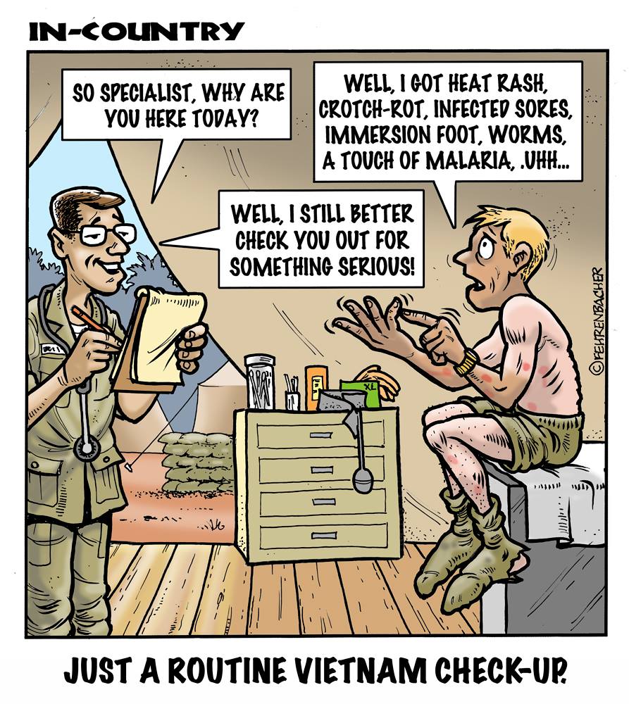 Phil enlisted in the Army in 1965 where you served for years in Vietnam. He became a graphic designer and has worked for the state of Oregon for 26 years. He retired in 2003 and started the Cartoon "In-Country". The cartoons reflect his experiences during his tour of duty in South Vietnam.